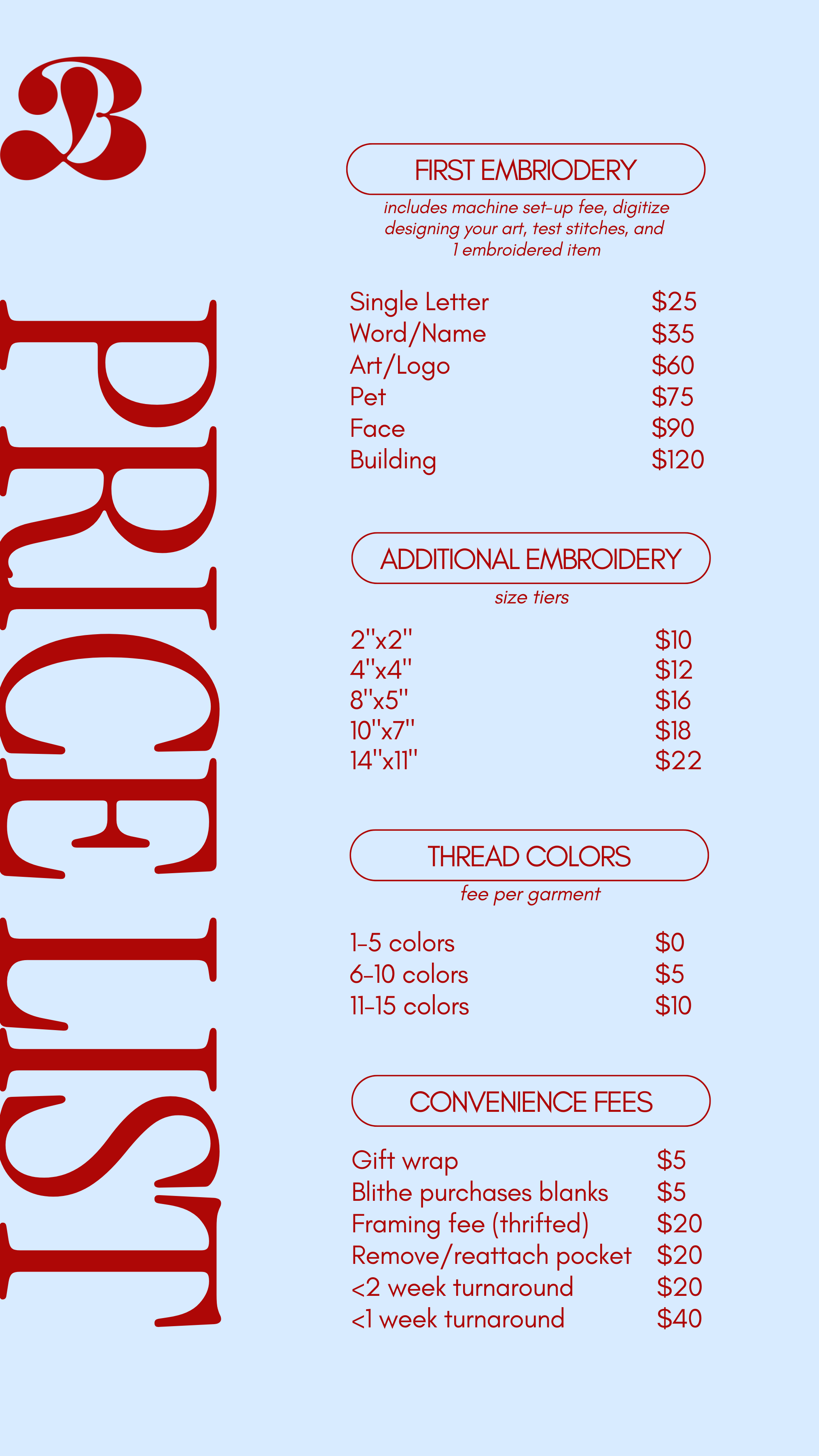 Since Blithe Embroidery is a one-woman show and side business that only operates on the weekends and has had a queue of orders since opening, when you order your will automatically be placed in the queue. If you need your item sooner than it’s placement in the queue you can get a rushed service for a fee.